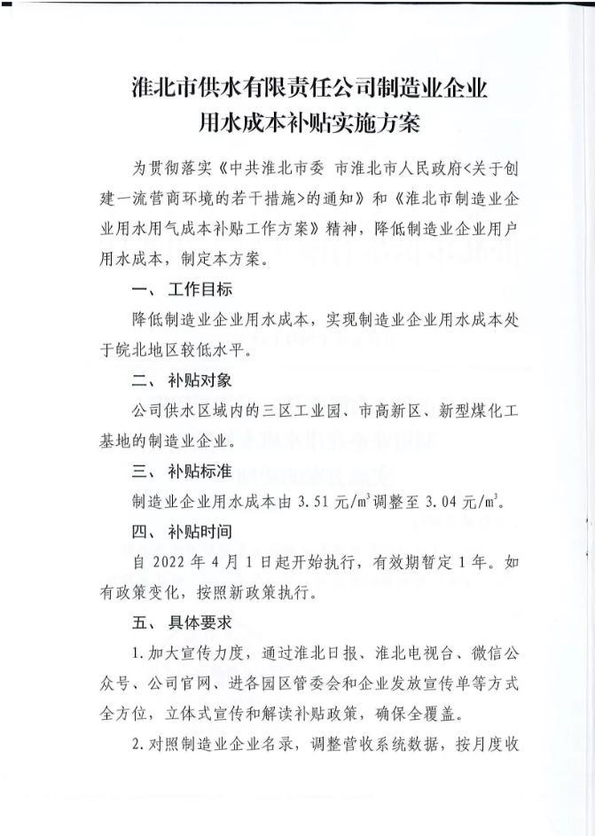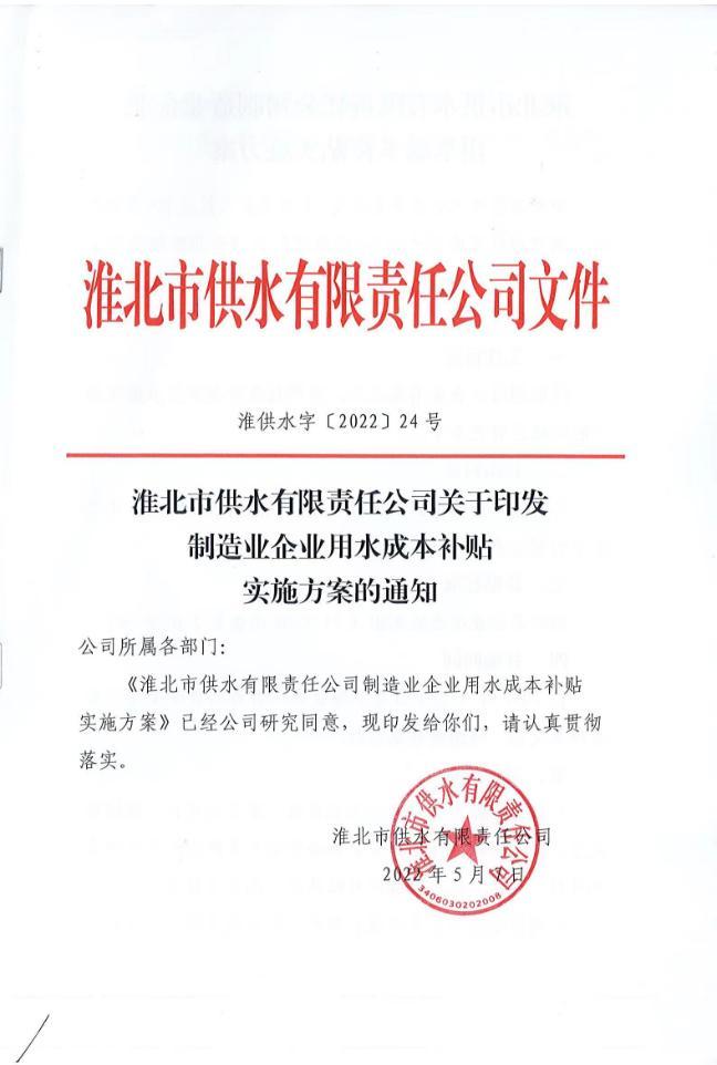 淮北市供水有限責任公司關于印發(fā)制造業(yè)企業(yè)用水成本補貼實施方案的通知 淮供水字【2022】24號