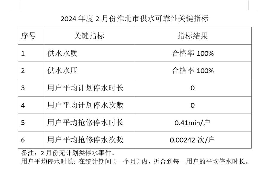 2024年度2月份淮北市供水可靠性關(guān)鍵指標
